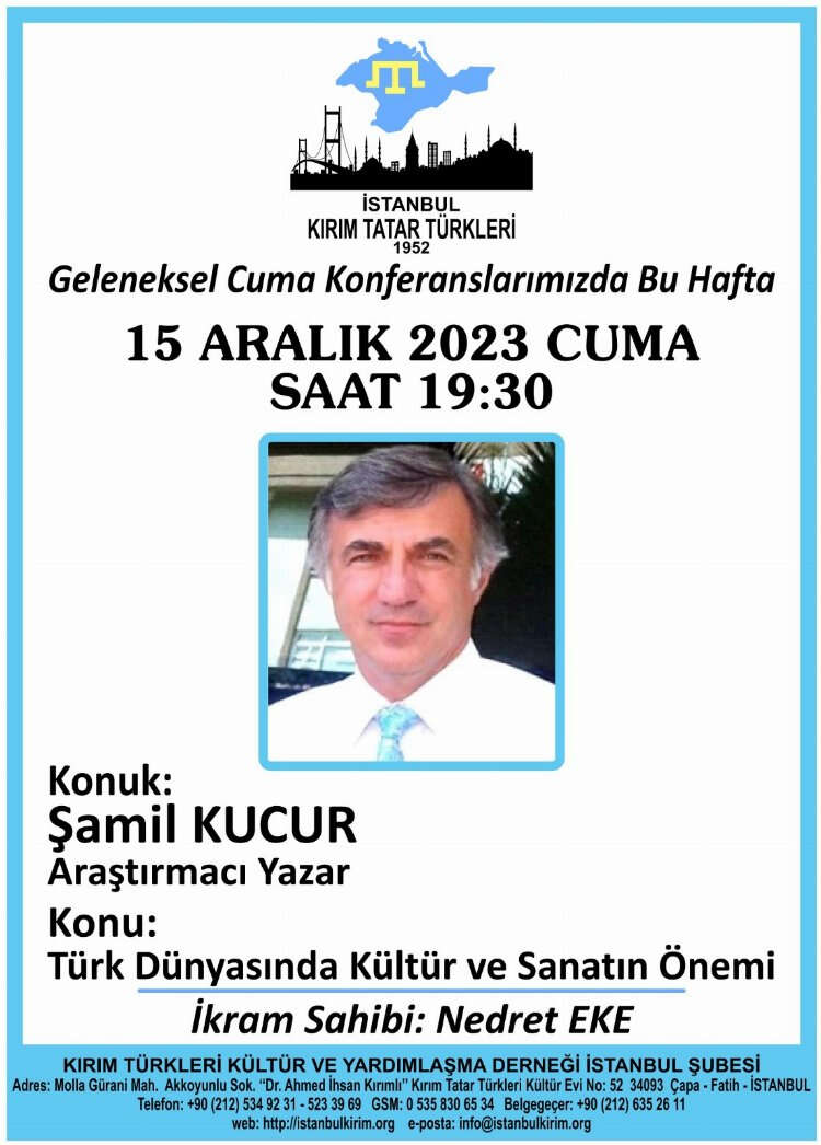 Kırım Derneği İstanbul Şubesi, 15 Aralık 2023 tarihinde araştırmacı yazar Şamil Kucur'un konuşmacı olarak katılacağı "Türk Dünyasında Kültür ve Sanatın Önemi" konulu konferansa ev sahipliği yapacak.