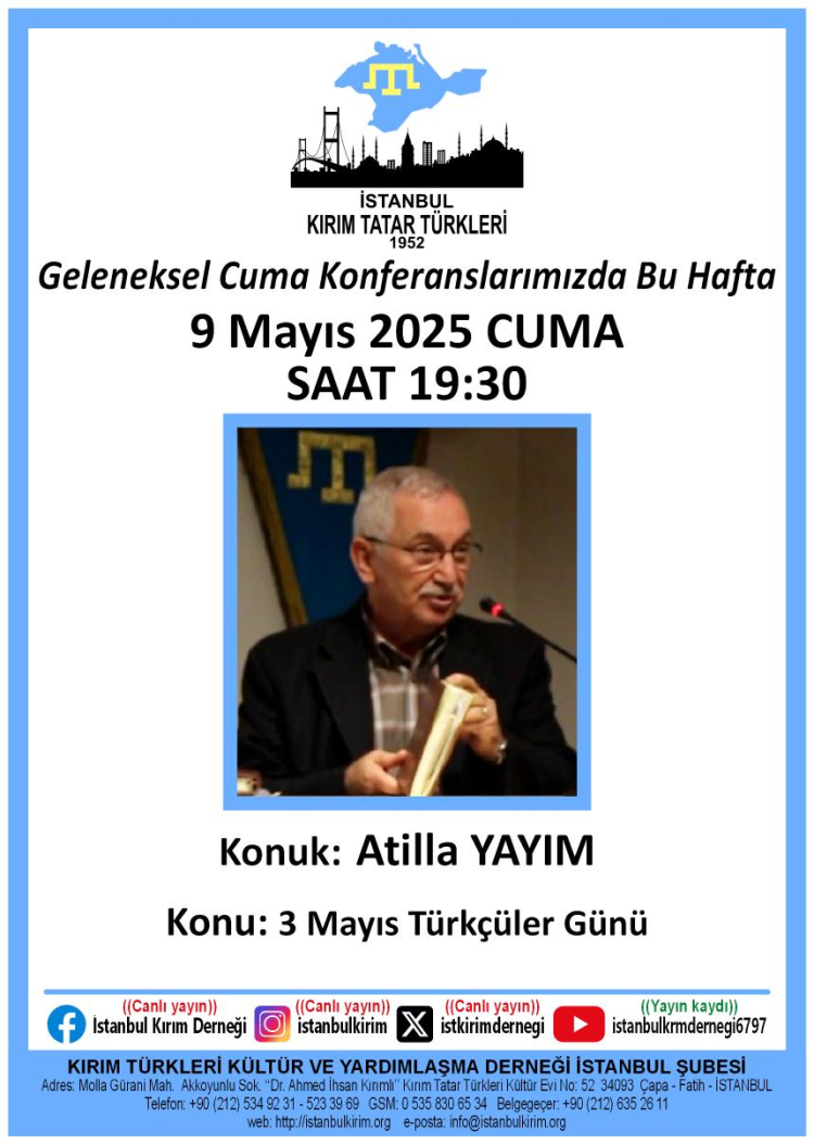 Kırım Derneği İstanbul Şubesi, 9 Mayıs 2025 tarihinde Atilla Yayım'ın konuşmacı olarak katılacağı "3 Mayıs Türkçüler Günü" konulu konferansa ev sahipliği yapacak.