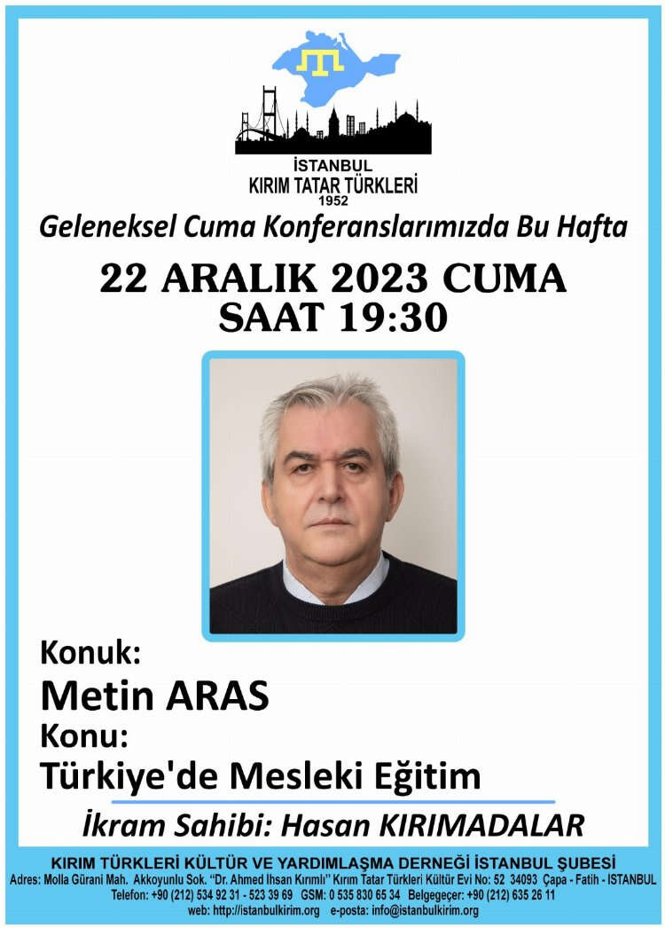 Kırım Derneği İstanbul Şubesi, 22 Aralık 2023 tarihinde Metin Aras'ın konuşmacı olarak katılacağı "Türkiye'de Mesleki Eğitim" konulu konferansa ev sahipliği yapacak.