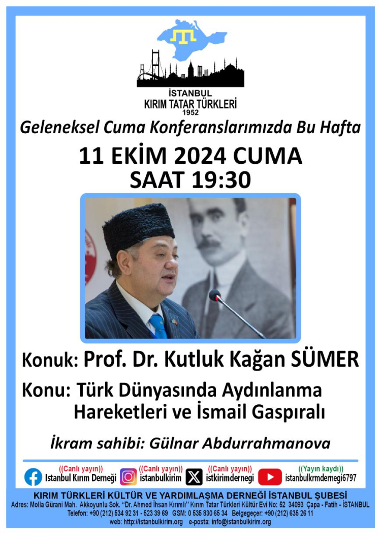 Kırım Derneği İstanbul Şubesi, 11 Ekim 2024 tarihinde Prof. Dr. Kutluk Kağan Sümer'in konuşmacı olarak katılacağı "Türk Dünyasında Aydınlanma Hareketleri ve İsmail Gaspıralı" konulu konferansa ev sahipliği yapacak.