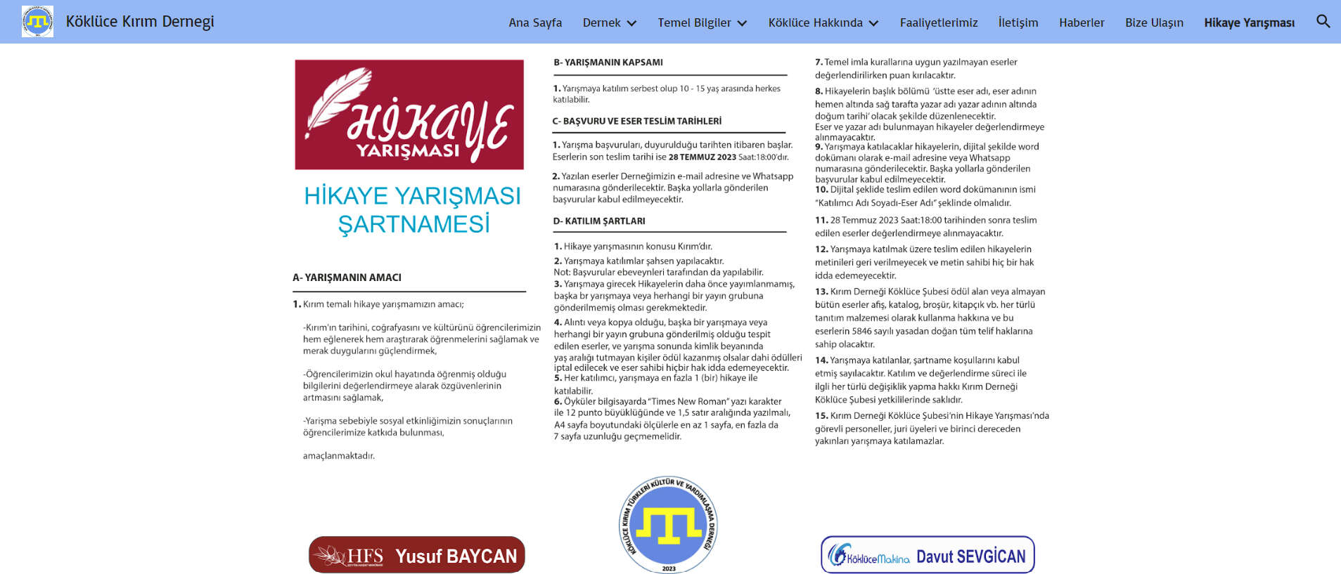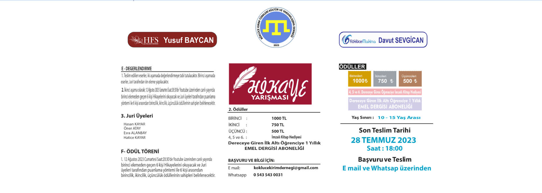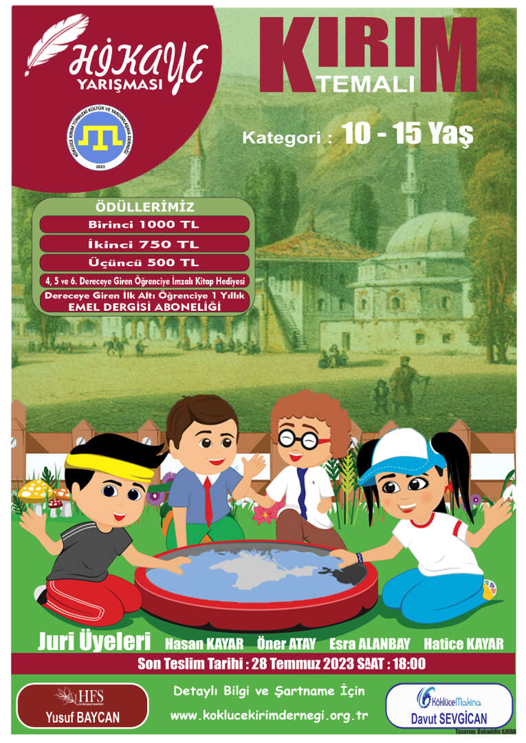 Kırım Türkleri Kültür ve Yardımlaşma Derneği Köklüce Şubesinin 10-15 yaş aralığında olan tüm gençlerin katılabileceği ve kendilerini deneme fırsatı bulabileceği “Kırım Temalı Hikaye Yarışması”na başvurular 01 Haziran 2023 tarihi itibarıyla başladı. Hikaye yarışmasına başvurular 28 Temmuz 2023 tarihinde saat 18.00’e kadar devam edecek.