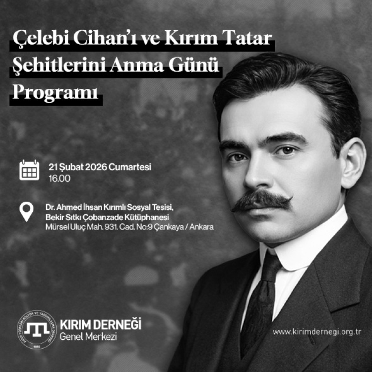 Kırım Türkleri Kültür ve Yardımlaşma Derneği 21 Şubat 2026 tarihinde gerçekleştireceği programla Kırım Tatarlarının unutulmaz lideri, Antlı Şehit Numan Çelebicihan'ı ve Kırım Tatar şehitleri anacak.