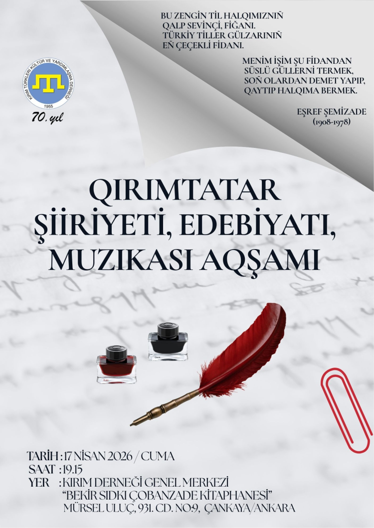 Genel Merkezimizin eski binasında ve Hamamönü Kabakçı Konağı’nda yıllarca 'Kırım Tatar Şiir ve Edebiyat Akşamları' düzenlemiştik. Pek çok arkadaşımız bu akşamlarda ana dilimize meraklanmış ve zengin dilimizi, edebiyatımızı, şiiriyetimizi tanıma imkânı bulmuştu. Ancak düzenlemekte olduğumuz bu şiir ve edebiyat akşamlarımıza yeni binamıza taşındıktan sonra çeşitli sebeplerle ara vermek durumunda kalmıştık. Bu güzel faaliyetimize tekrar başlıyoruz. Yeni binamızda, yeniden düzenleyeceğimiz 'Qırımtatar Şiiriyeti, Edebiyatı ve Muzıqası Aqşamları'nın ilki 17 Nisan 2026 Cuma günü saat 19.15’te Bekir Sıdkı Çobanzade Kitaphanemizde gerçekleştirilecektir. Bu etkinliğimize Kırım Tatar Dil ve Edebiyatı’nı merak eden, hayatında farklı bir renk olmasını isteyen herkesi ve edebiyata meraklı tüm heveskâr arkadaşlarımızı davet ediyoruz.