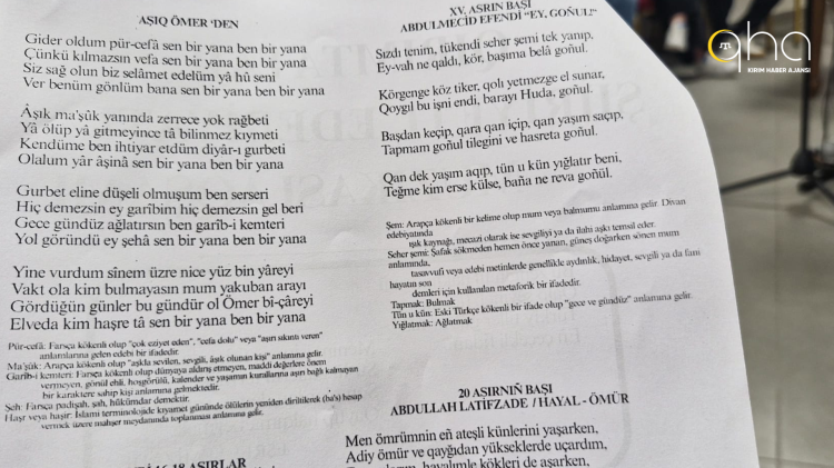 Bununla birlikte Kırım Derneği gönüllülerinden Zemine Cengiz, Abdulmecid Efendi’den “Ey, goñul!” ve Yunus Qandım’dan “Han Cami Levhaları”; Aziz İlyasov, Bora Ğazi Giray Han’dan “Dolab” ve Cemil Kermençikli’den “Tatarım”; Tuğçe Ağıral, Abdullah Latifzade’den “Hayal-Ömür”; Naciye Gezer, Mehmet Niyaziy’den “Yeşil Ada”; Vehbi İldar Şahin, Hamdi Giraybay’dan “Senmi Ediñ?” ve Ülkücan Sütbaş ise Şakir Selim’den “Bir Gecede” şiirlerini okudu.