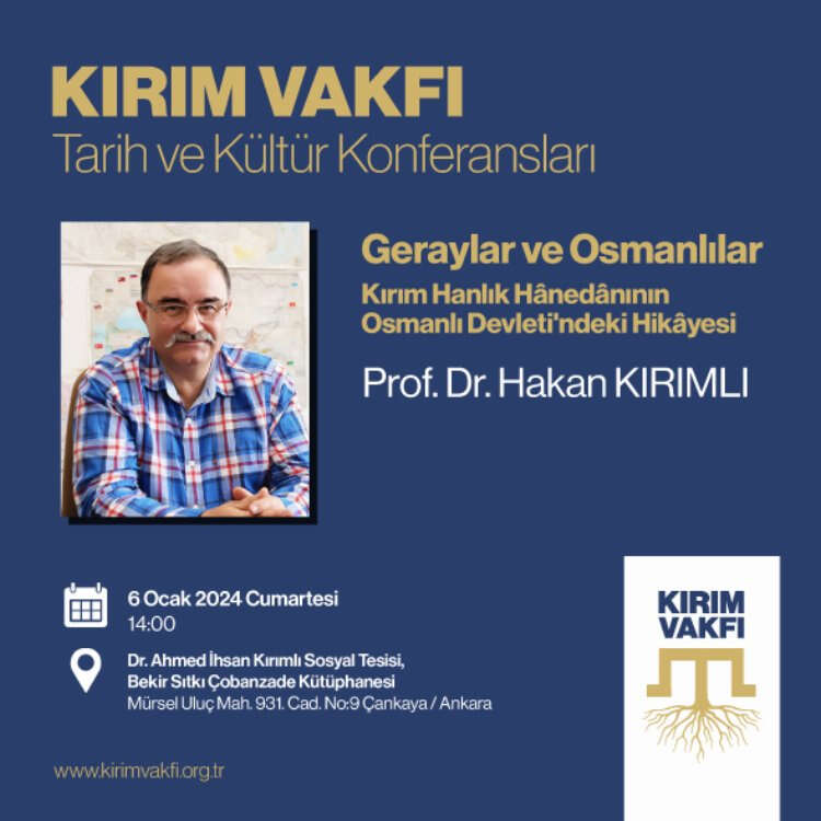Kırım Vakfı tarafından geleneksel olarak düzenlenen “Tarih ve Kültür Konferansları” çerçevesinde 6 Ocak 2024 tarihinde Bilkent Üniversitesi Uluslararası İlişkiler Bölümü Öğretim Üyesi Doç. Dr. Hakan Kırımlı'nın konuşmacı olacağı Geraylar ve Osmanlılar konulu konferans tertip edilecek.