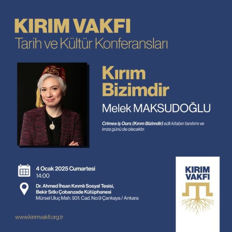 Kırım Vakfıtarafından geleneksel olarak her ayın ilk cumartesi günü düzenlenen “Tarih ve Kültür Konferansları” çerçevesinde, 4 Ocak 2025 Cumartesi günü Melek Maksudoğlu'nun konuşmacı olarak katılacağı "Crimea is Ours (Kırım Bizimdir)" konulu konferansın yapılacağı öğrenildi.