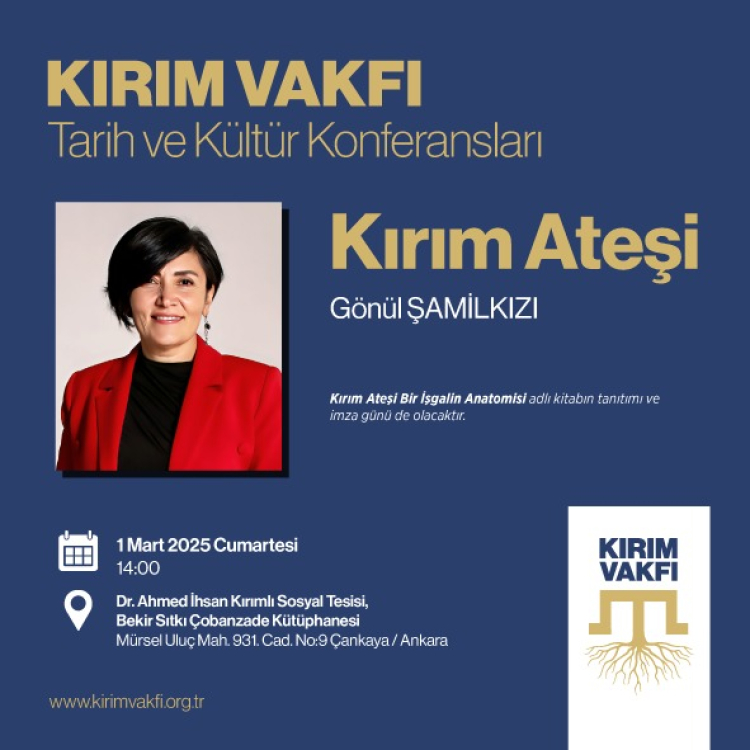 2014 yılında Kırım'ın Rusya tarafından işgalini takip ederek, "Kırım Ateşi-Bir İşgalin Anatomisi" isimli kitabı kaleme alan gazeteci-yazar Gönül Şamilkızı, 1 Mart 2025 tarihinde Kırım Vakfının konuğu olacak. Şamilkızı tanıtımın ardından katılımcılara kitabını imzalayacak.