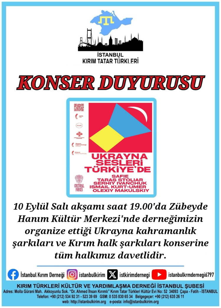 Kırım Derneği İstanbul Şubesi tarafından 10 Eylül 2024 tarihinde düzenlenecek programda, Kültür Güçleri grubu Zübeyde Hanım Kültür Merkezi'nde konser verecek.