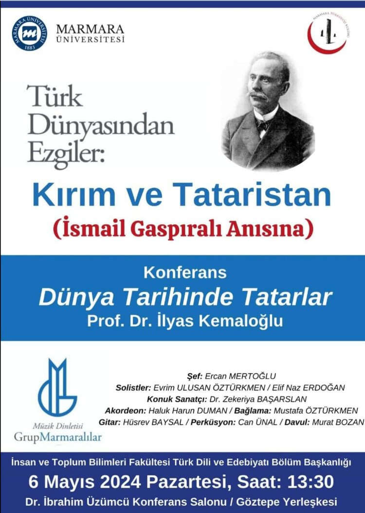 Marmara Üniversitesi Türkoloji Kulübü, 6 Mayıs 2024 tarihinde saat 13.30'da "Türk Dünyasından Ezgiler: Kırım ve Tataristan (İsmail Gaspıralı Anısına)" başlıklı bir etkinlik düzenleyecek.