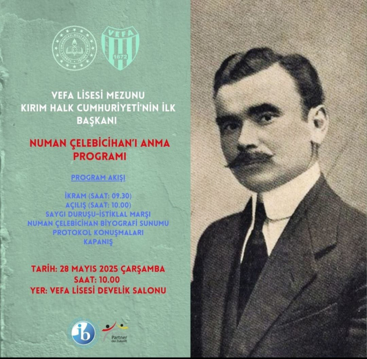 Kırım Halk Cumhuriyeti’nin kurucusu ve ilk başkanı Antlı Şehit Numan Çelebicihan, doğumunun 140. yılı dolayısıyla mezun olduğu İstanbul Vefa Lisesinde 28 Mayıs 2025 Çarşamba günü düzenlenen anlamlı bir anma programı ile anılacak.