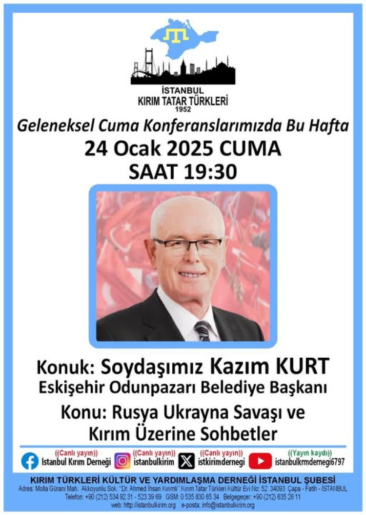 Kırım Derneği İstanbul Şubesi, 24 Ocak 2025 tarihinde Odunpazarı Belediye Başkanı Av. Kazım Kurt'un konuşmacı olarak katılacağı "Rusya Ukrayna Savaşı ve Kırım Üzerine Sohbetler" konulu programa ev sahipliği yapacak.