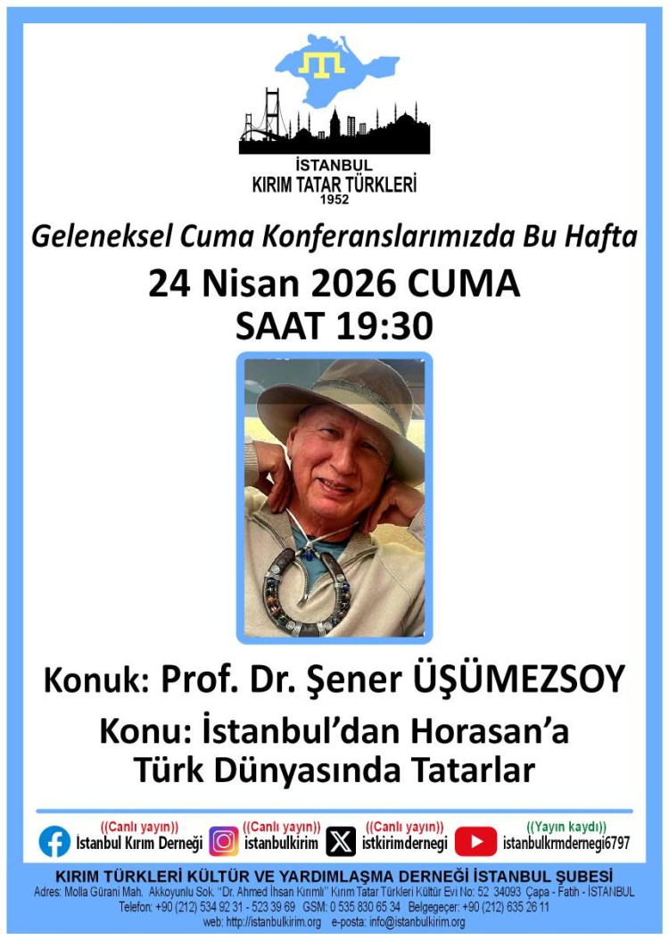 Kırım Türkleri Kültür ve Yardımlaşma Derneği İstanbul Şubesi, 24 Nisan’da düzenleyeceği konferansta Prof. Dr. Şener Üşümezsoy’u ağırlayacak. “İstanbul’dan Horasan’a Türk Dünyasında Tatarlar” başlıklı etkinlik saat 19.30’da başlayacak ve çevrim içi olarak da izlenebilecek.