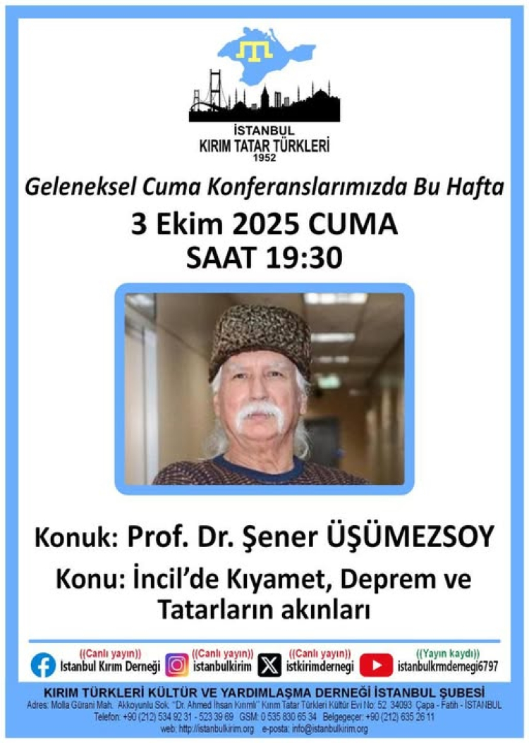 Kırım Derneği İstanbul Şubesi 3 Ekim 2025 tarihinde "İncil'de Kıyamet, Deprem ve Tatarların Akını" başlığıyla deprem bilimci Prof. Dr. Şener Üşümezsoy'u konuk edecek.