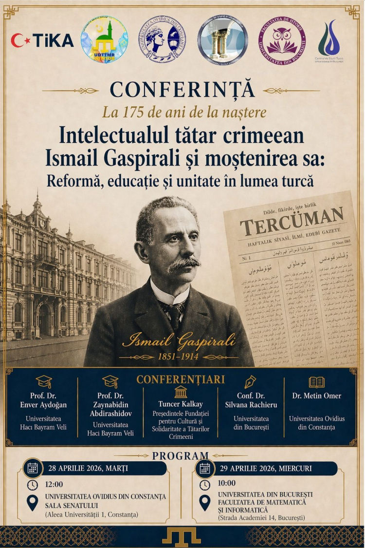 Türk İşbirliği ve Koordinasyon Ajansı (TİKA), Romanya Türk-Müslüman Tatarları Demokrat Birliği, Köstence Ovidius Üniversitesi Tarih ve Siyaset Bilimi Fakültesi ve Bükreş Üniversitesi Tarih Bölümü Türk Araştırmaları Merkezi iş birliğiyle düzenlenen “İsmail Gaspıralı ve Mirası: Reform, Eğitim ve Türk Dünyasında Birlik” başlıklı konferans, 28-29 Nisan 2026 tarihlerinde Köstence ve Bükreş’te gerçekleştirilecek.