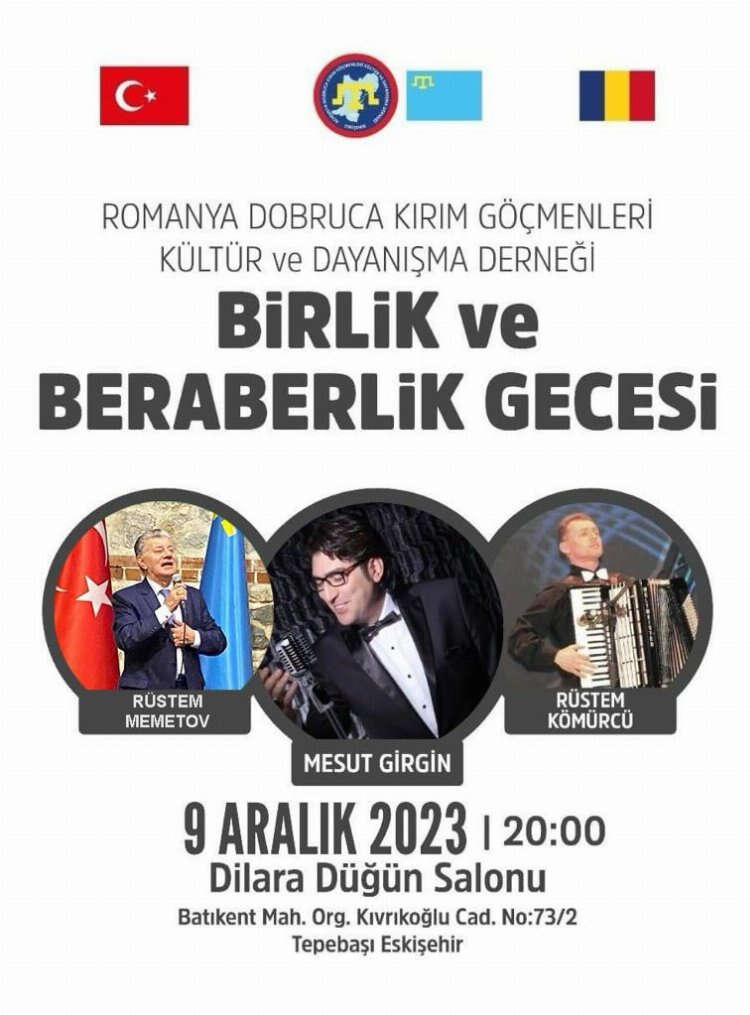 Romanya Dobruca Kırım Göçmenleri Kültür ve Dayanışma Derneği, 9 Aralık 2023 tarihinde Eskişehir'de "Birlik ve Beraberlik Gecesi" düzenleyecek.