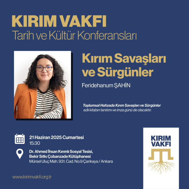 Kırım Türkleri Kültür ve Yardımlaşma Vakfı düzenlediği Tarih ve Kültür Konferansları kapsamında "Toplumsal Hafızada Kırım Savaşları ve Sürgünler” isimli eserin yazarı Ferihanum Şahin’i ağırlayacak.