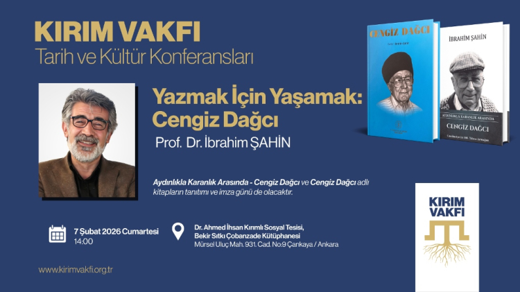 Kırım Türkleri Kültür ve Yardımlaşma Vakfının düzenli olarak her ayın ilk cumartesi günü düzenlediği Tarih ve Kültür Konferansları kapsamında 7 Şubat 2026 tarihinde Prof. Dr. İbrahim Şahin “Yazmak İçin Yaşamak: Cengiz Dağcı” konusunu anlatacak.
