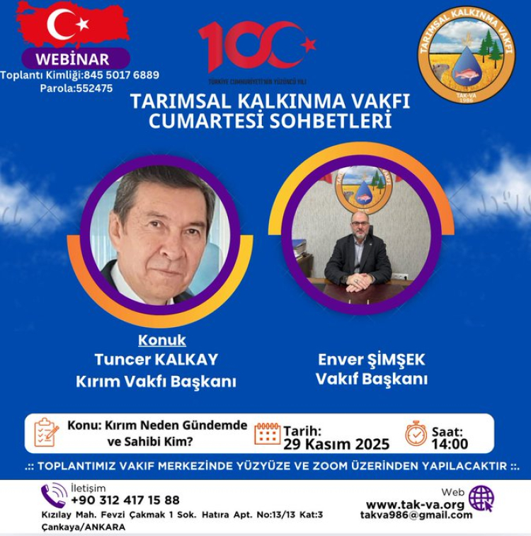 Kırım Vakfı Başkanı Tuncer Kalkay, Tarımsal Kalkınma Vakfı tarafından düzenlenen konferansta; Trump'ın sözde barış planı taslağını, Ukrayna'yı, işgal altındaki Kırım'ı ve Kırım Tatarlarını anlatacak.