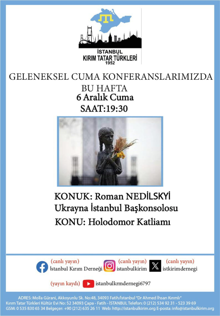 Kırım Türkleri Kültür ve Yardımlaşma Derneği İstanbul Şubesinin her hafta düzenlediği "Geleneksel Cuma Konferansları" kapsamında, bu hafta Holodomor Soykırımı ele alınacak. Milyonlarca insanın Stalin tarafından katledilmesine yol açan sunî açlık, 6 Aralık 2024 tarihinde konuşulacak.