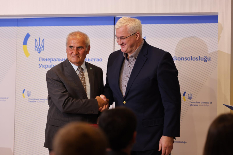 Ukrayna Dışişleri Bakanı Andriy Sıbiha, Antalya'da düzenlenen törenle Ümit Şilit ve Recep Şen'e Ukrayna devlet nişanlarını takdim etti.