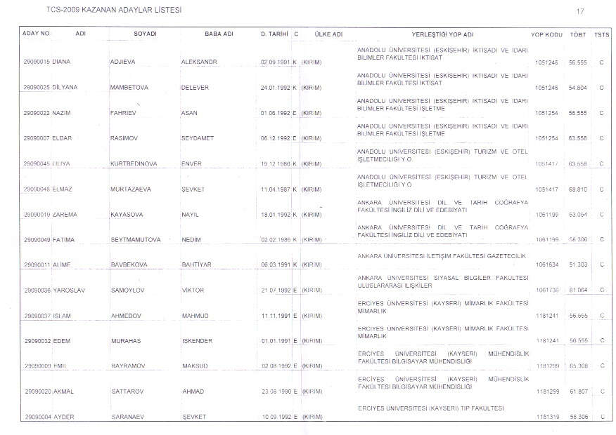 19 NİSAN 2009 TARİHİNDE YAPILAN TCS SINAVI SONUÇLARI 01