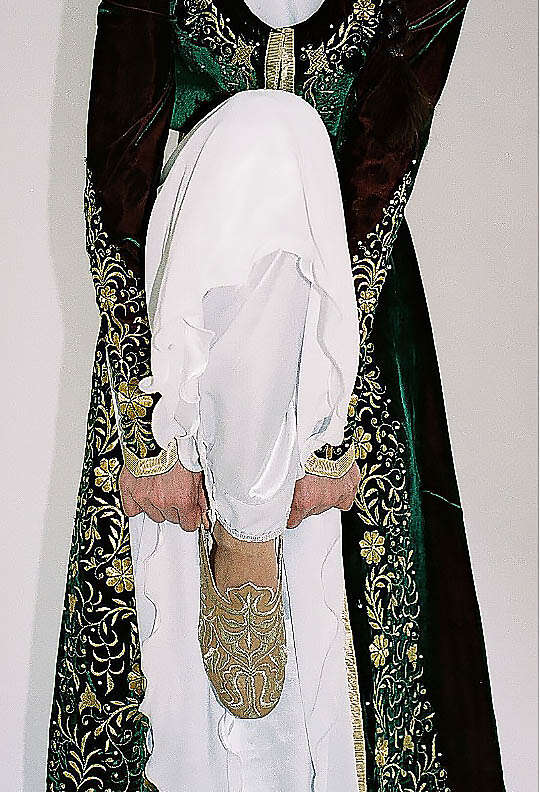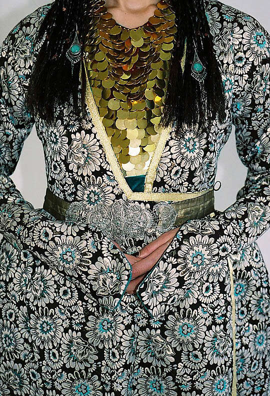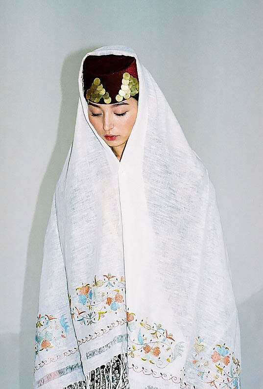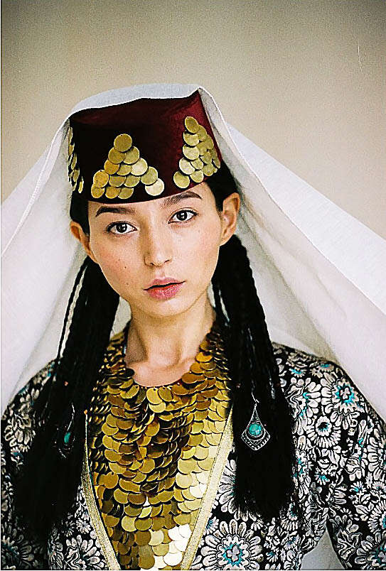 Model Evelina Mambetova, altın akçelerle süslenmiş fes ve göğüslüğü tanıtıyor.