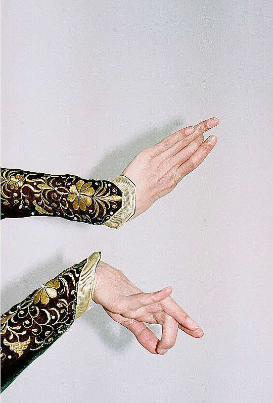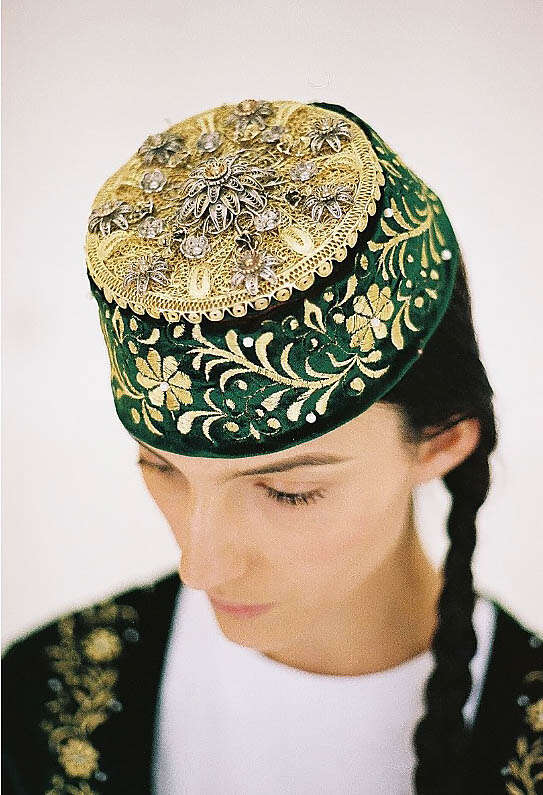 Kırım Tatar halk oyunları koreografı Elnara Abdullayeva'nın üzerinde altın işlemeli kadife elbise ve yeşil fes var.