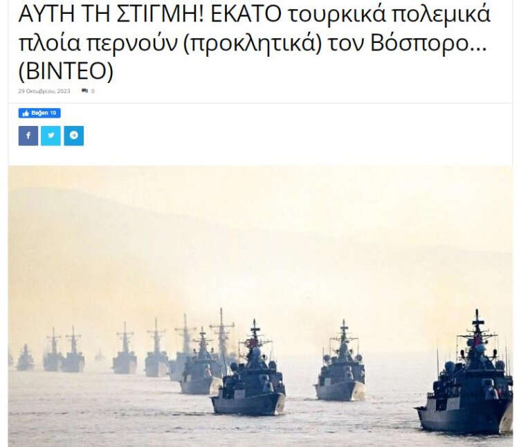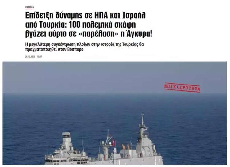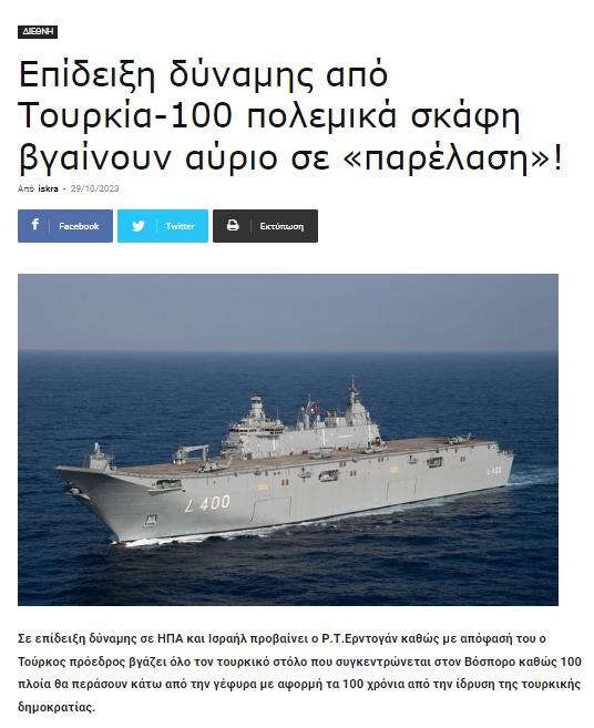 Defancenet haber sayfasında, "Türkiye Cumhuriyeti'nin kuruluşunun 100. yılını kutlamak için 100 gemi köprünün altından geçerken, tüm Türk filosu Erdoğan'ın emriyle güç gösterisi yapmak üzere Boğaz'da toplanıyor" ifadeleri yer aldı.