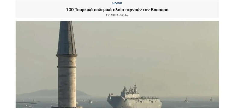 Cumhuriyet'in ilânının 100. yılını kutlamak için İstanbul Boğazı'nda gerçekleşen dev gösteri Yunan basınında güç gösterisi başlığıyla yer aldı.