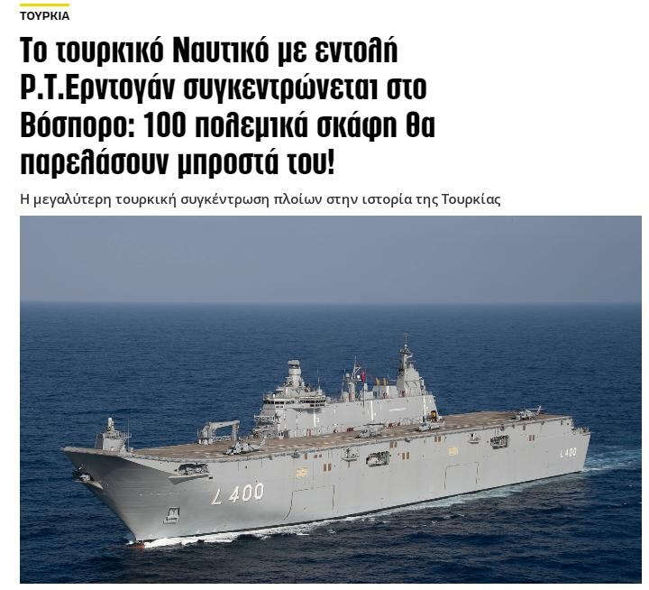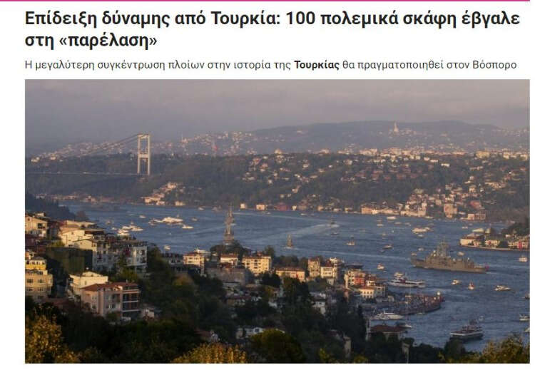ieidiseis.gr haber sayfasındaki başlıkta, "Türkiye'nin güç gösterisi: 100 savaş gemisi 'geçit törenine' çıkarıldı" denildi.