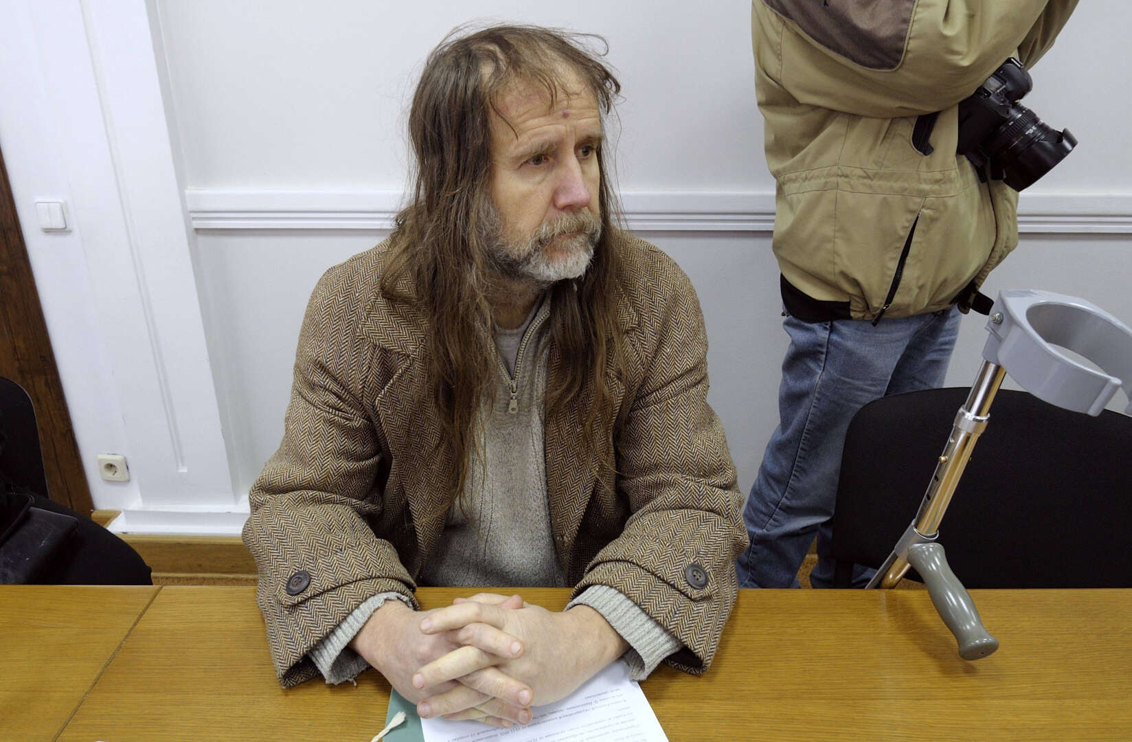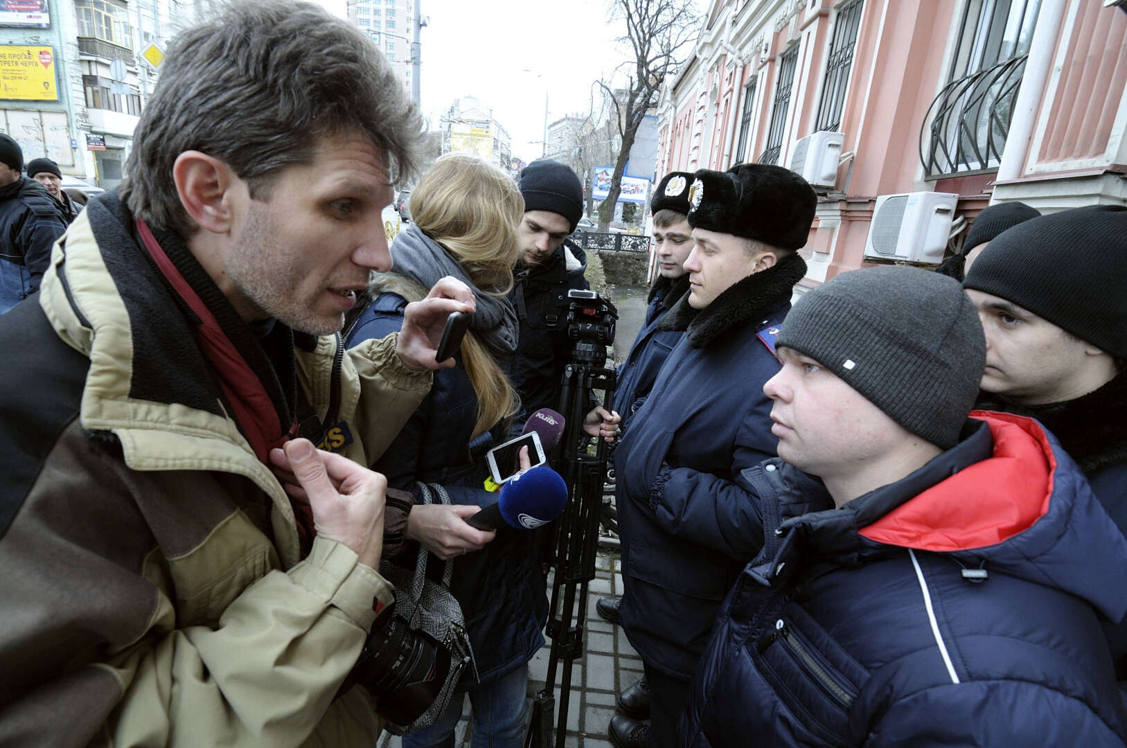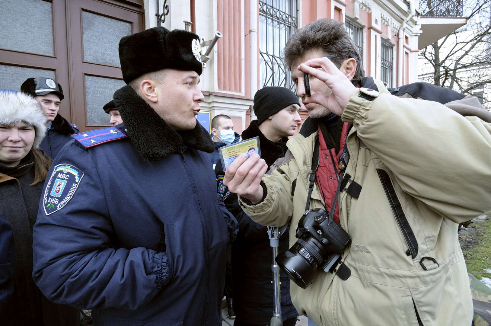 “Ekoloji ve Sosyal Koruma” gazetesinin muhabiri Vitaliy Tereşçenko, polise gazeteci kimliğini gösteriyor