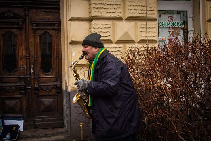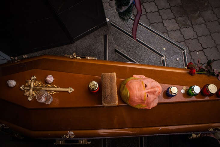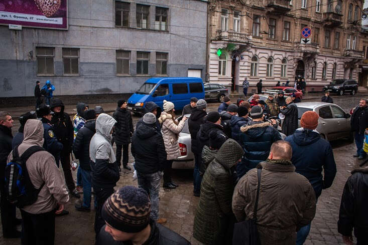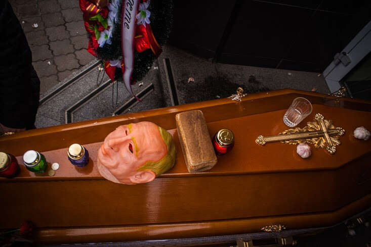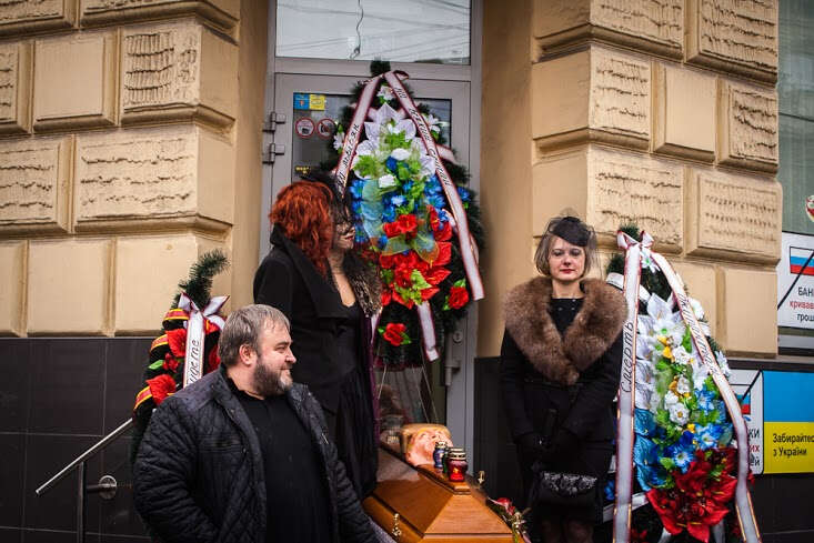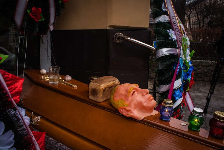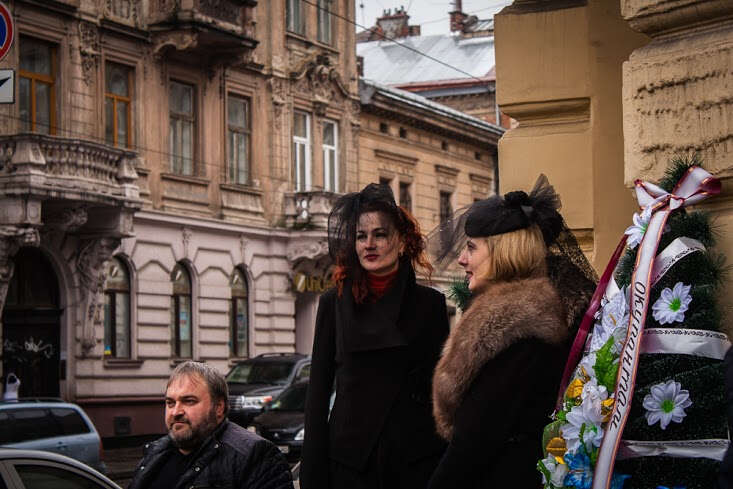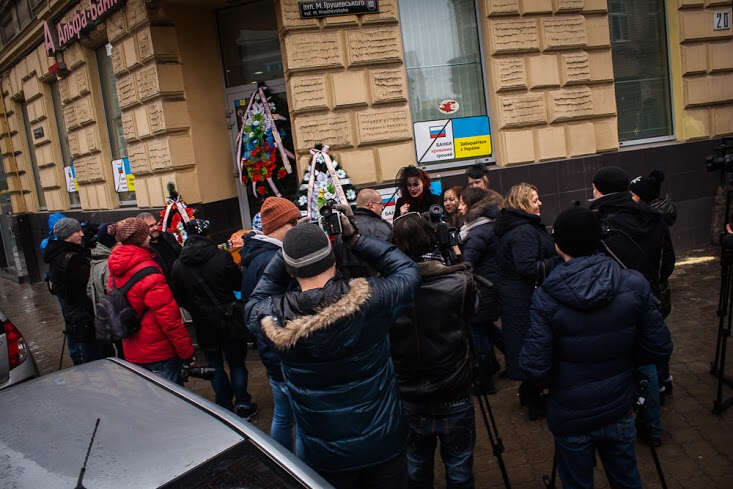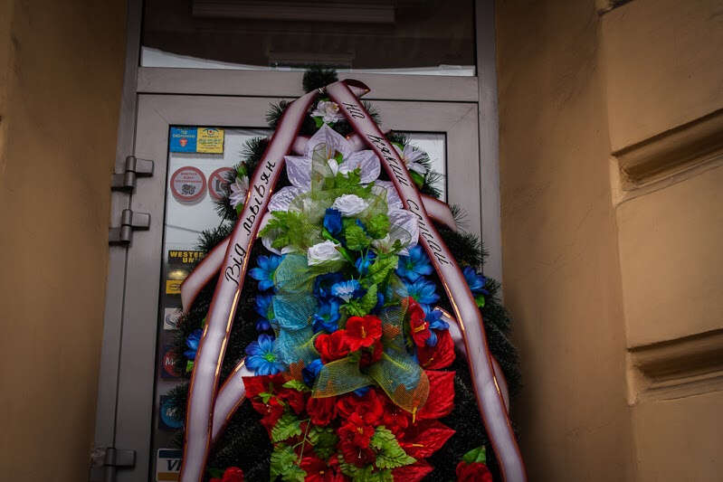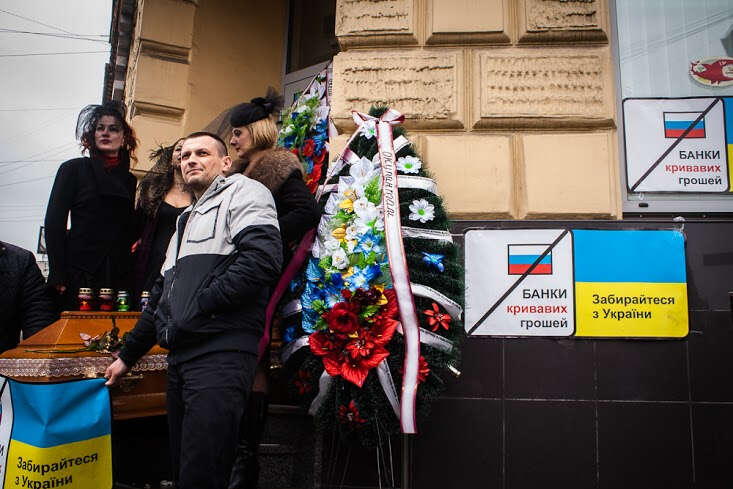 Lviv’de Rusya’nın en büyük bankalarından Alfa Bank’ın şubesinin kapatılması vesilesiyle 1 Şubat’ta “cenaze töreni” şeklinde bir eylem düzenlendi. Eylemciler, gençler Rus işgalcilere karşı savaşırken Rus banklarının ülkede faaliyet göstermesine karşı çıktı