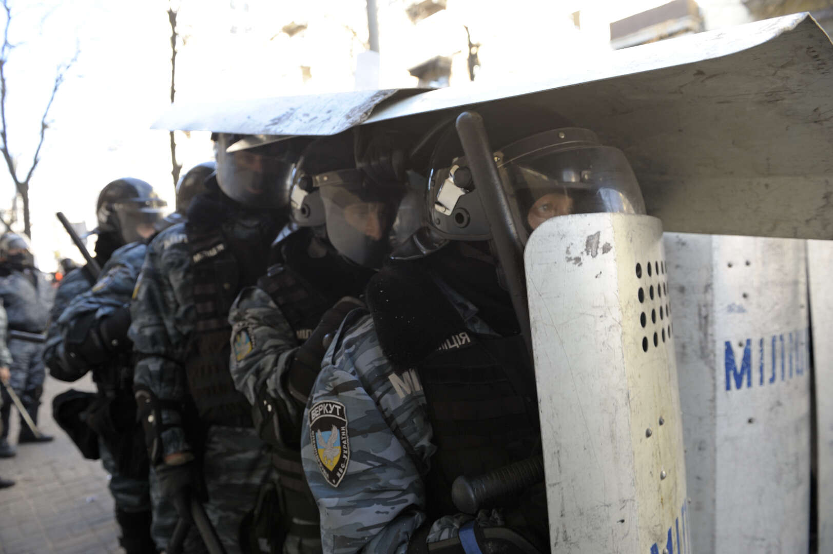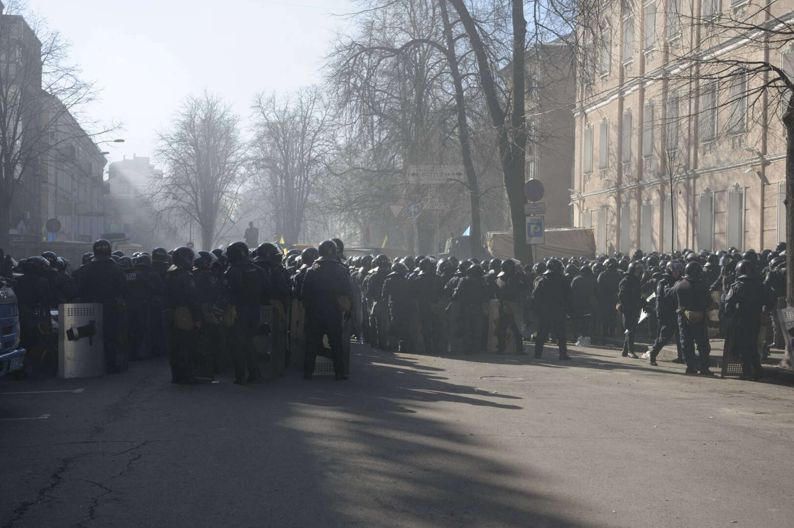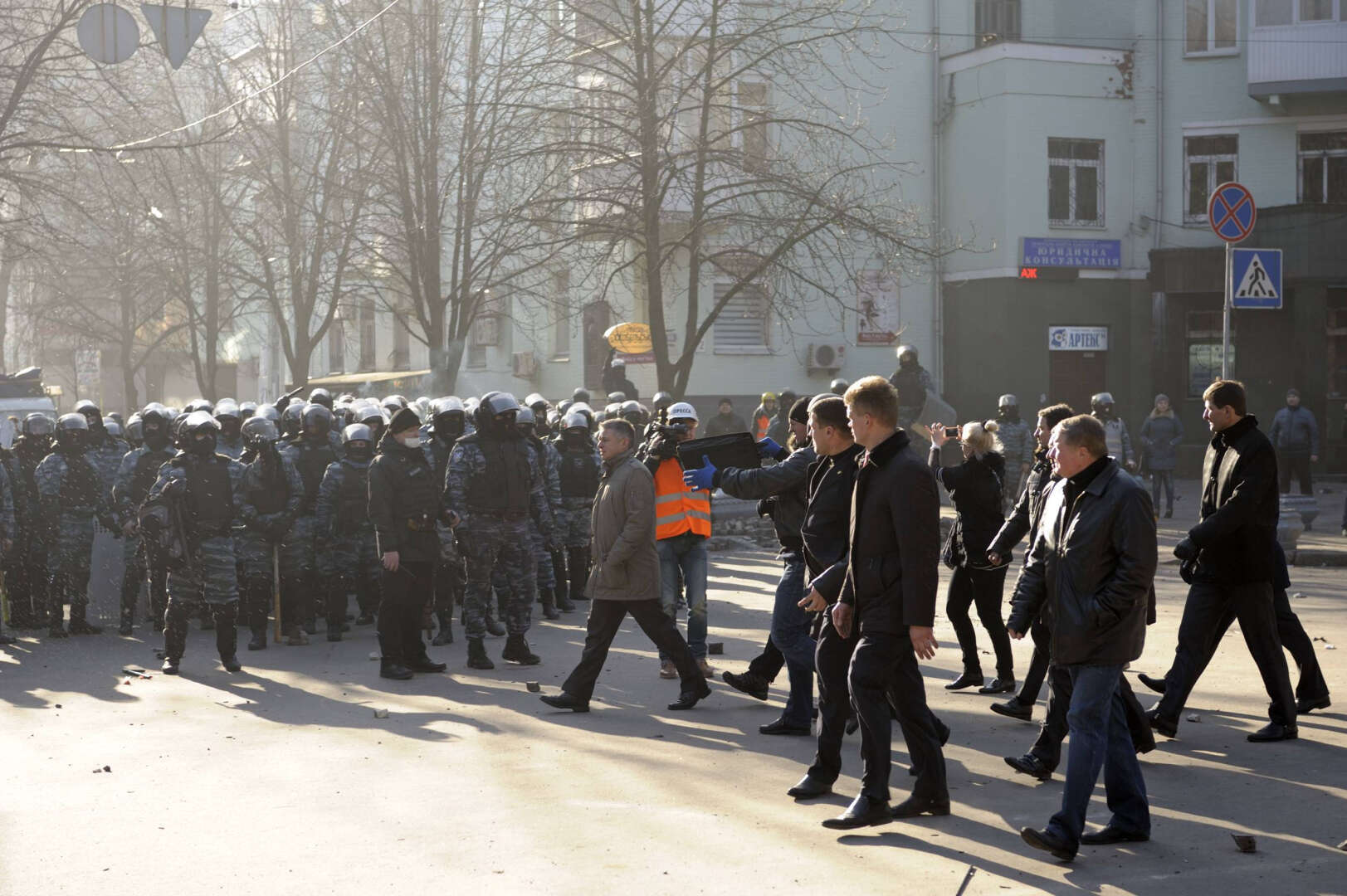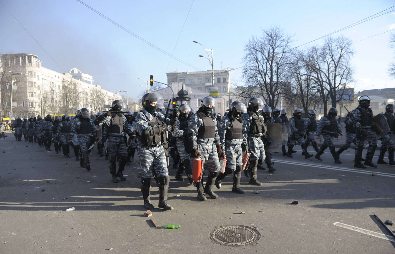 Berkut özel tim görevlileri, Meydan eylemcilerini Bağımsızlık Meydanı’na doğru iterek İnstituskaya caddesinden dönüyor.