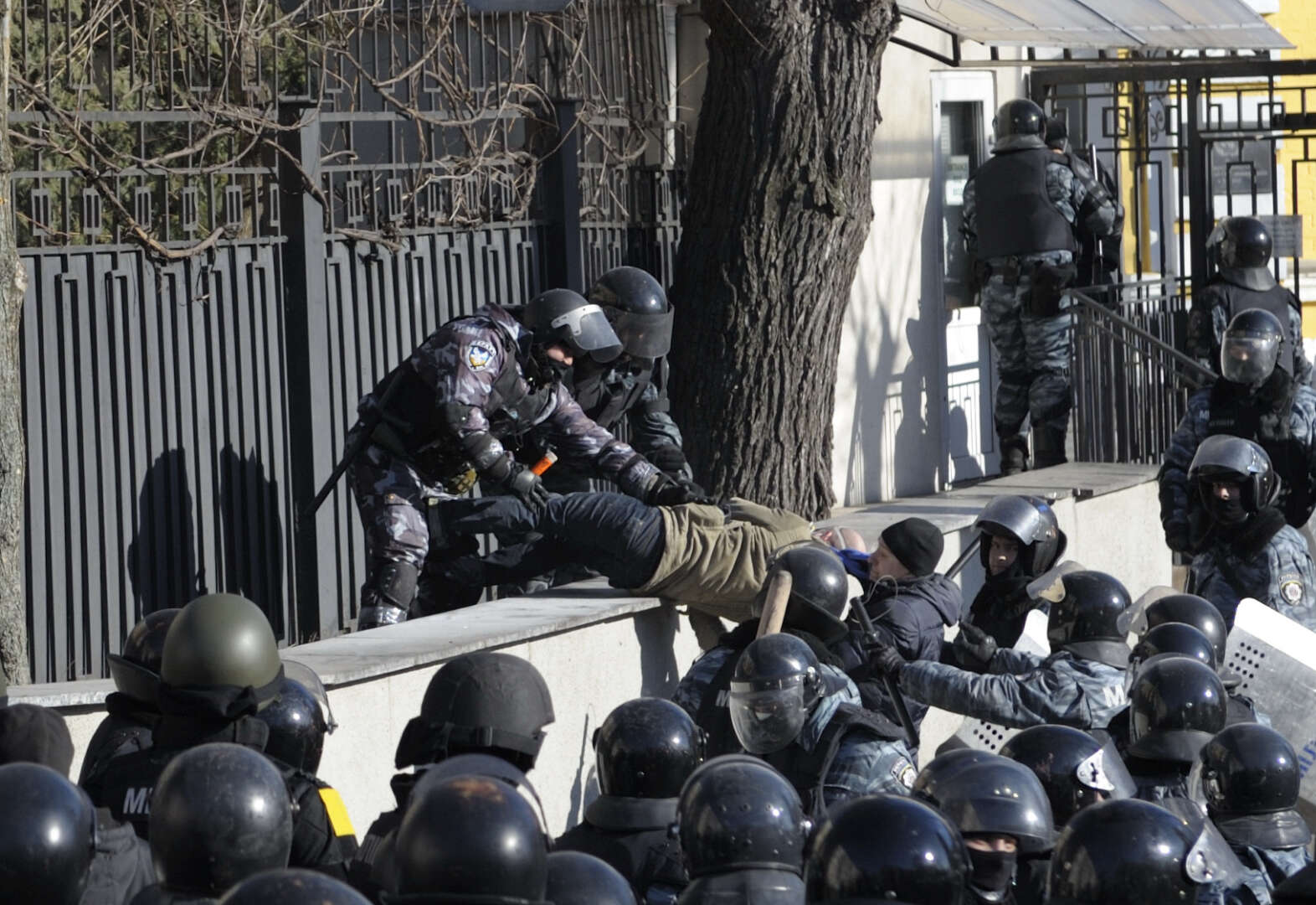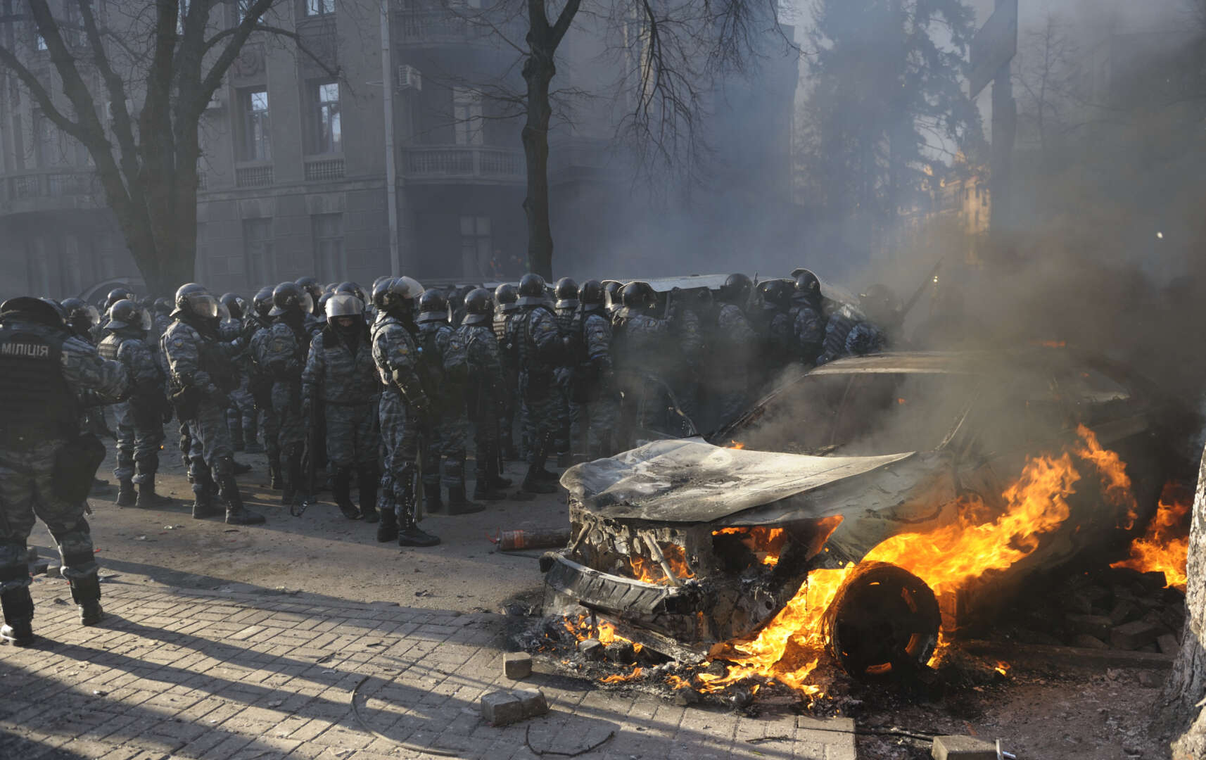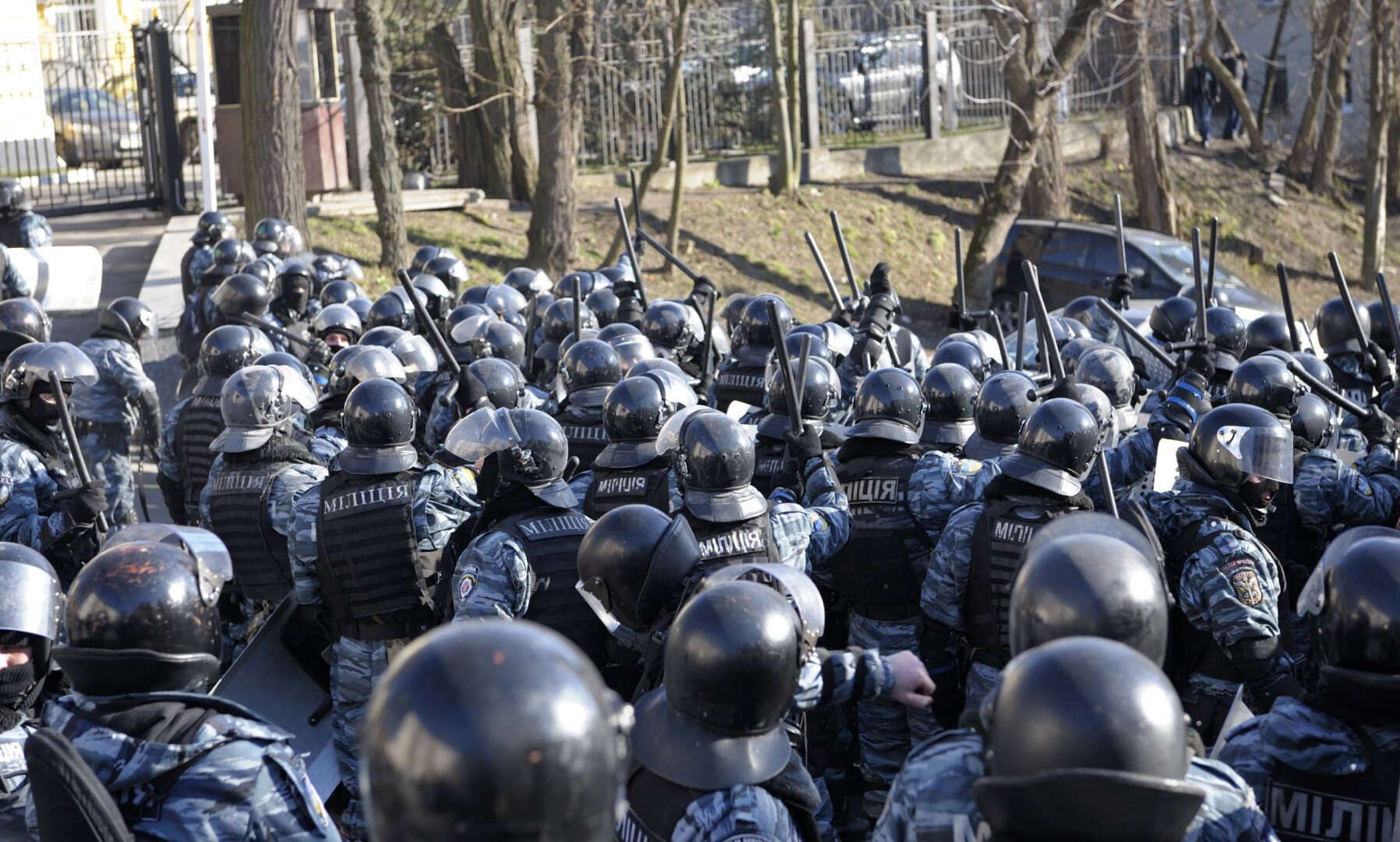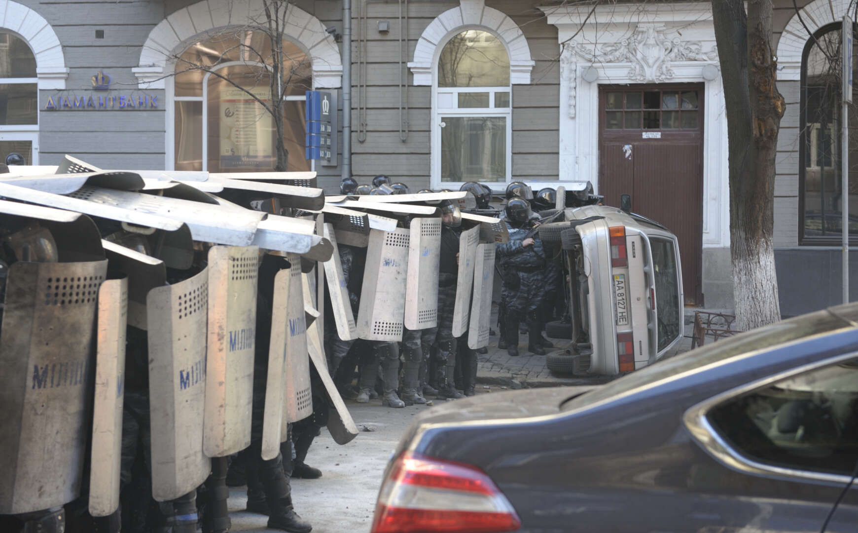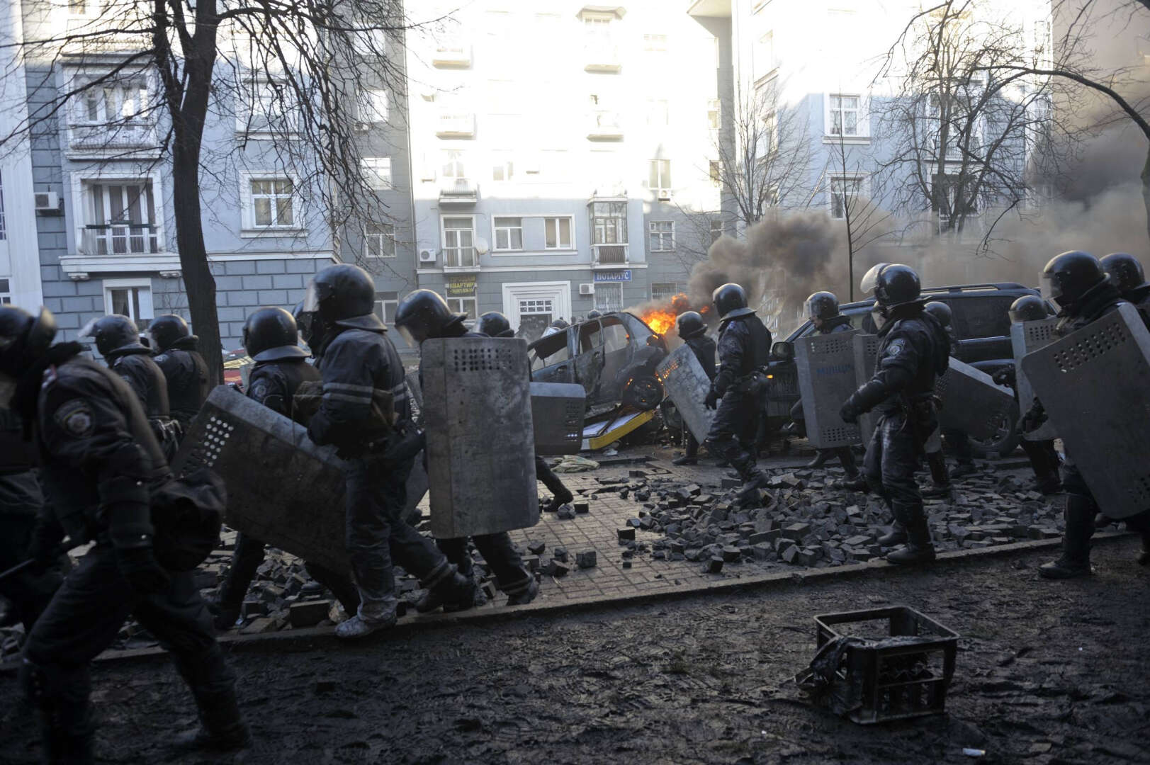 Berkut özel tim görevlileri, Meydan eylemcilerini Bağımsızlık Meydanı’na doğru iterek İnstituskaya caddesinden dönüyor.