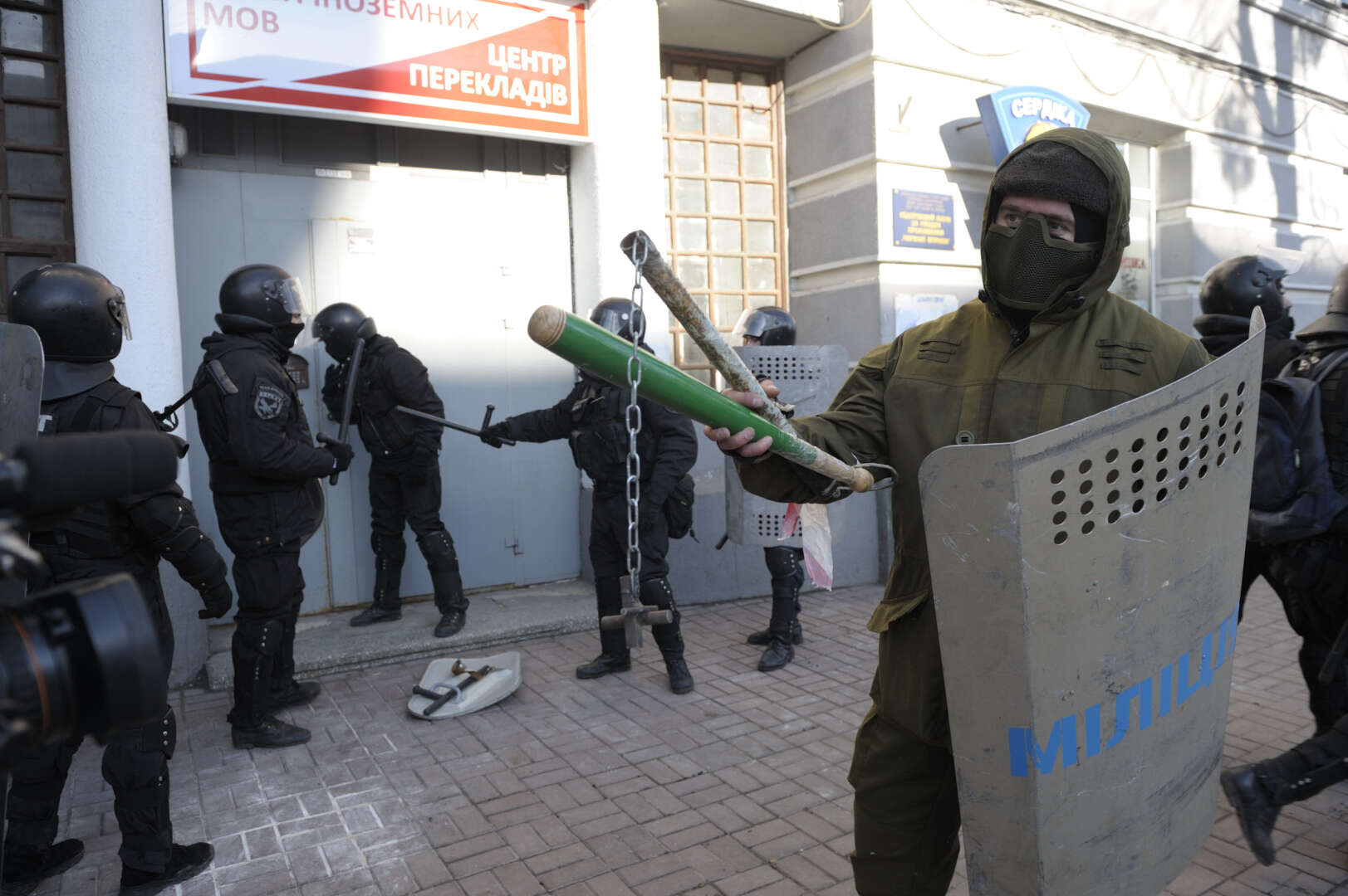 Tituşkalar (eylemlerde Rusya yanlısı çeteler), bir kişiyi esir aldı. İç birliklerinin askerleri sadece gözetliyordu.
