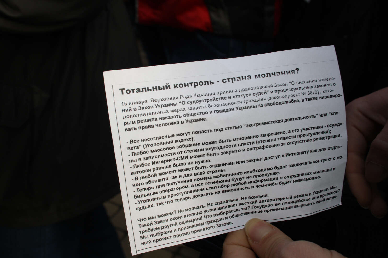 Sivil toplum aktivistleri ve gazeteciler 17 Ocak tarihinde Ukrayna Parlamentosu’nun bir dizi tartışmalı yasa kabul etmesini protesto etti.