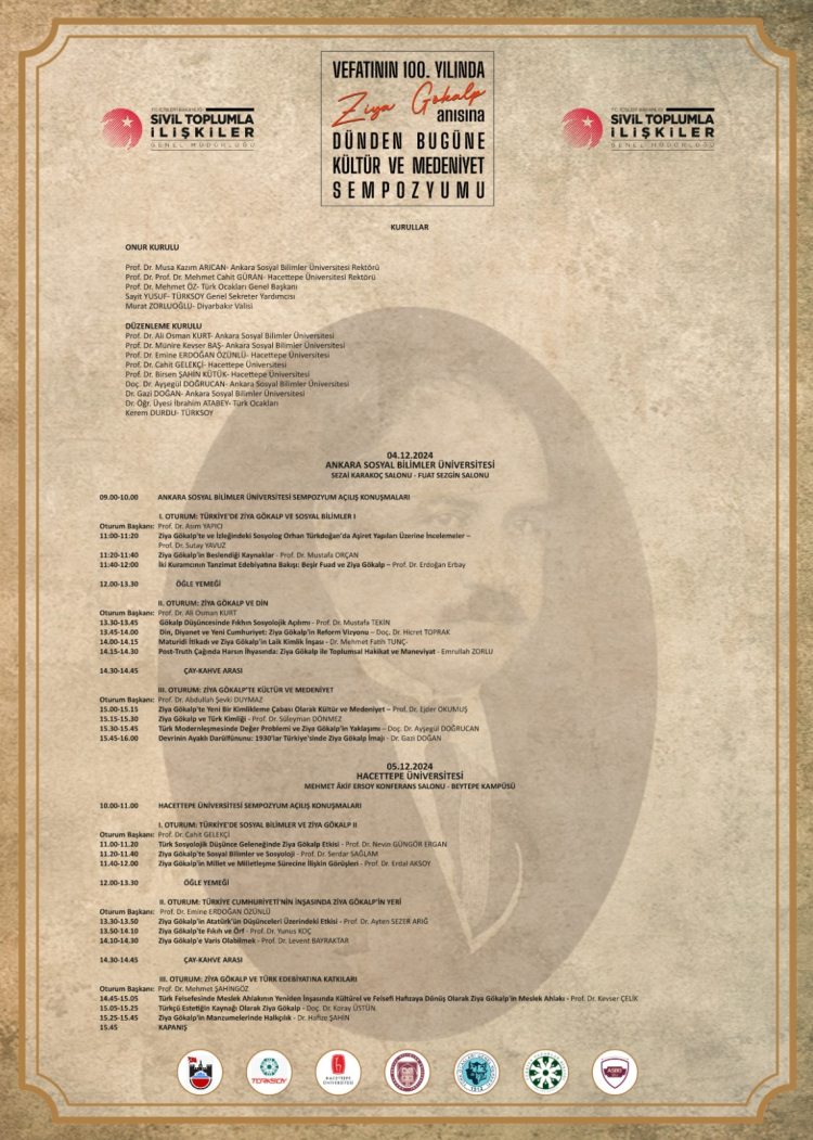 Türkiye'nin başkenti Ankara'da 4-5 Aralık 2024 tarihlerinde "Vefatının 100. yılında Ziya Gökalp Anısına Dünden Bugüne Kültür ve Medeniyet Sempozyumu"icra edilecek.