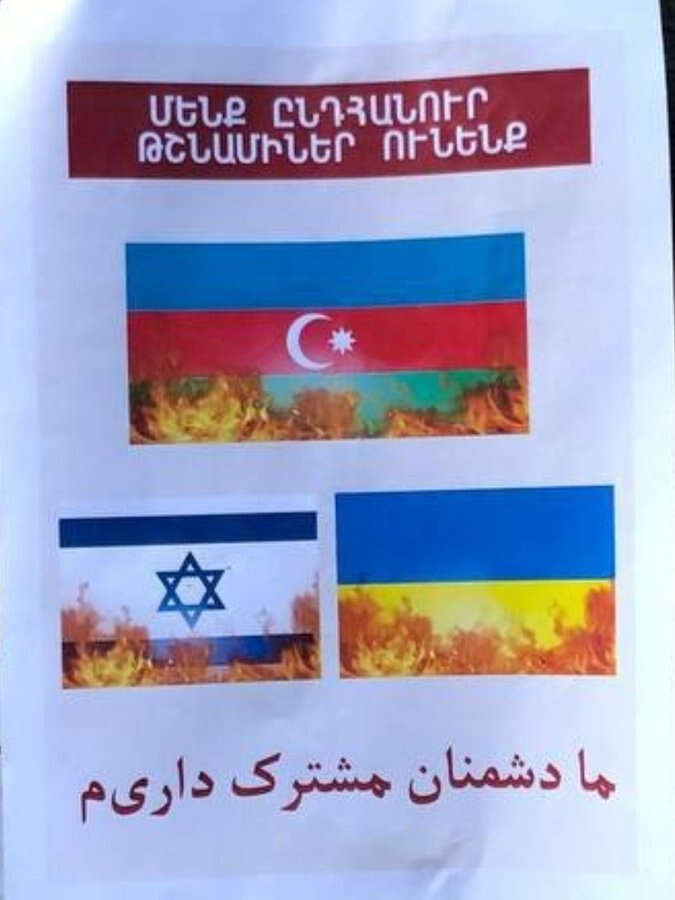 Rusya'nın desteğine ihtiyaç duyan Ermenistan'da Rus yanlısı propaganda afişleri dağıtıldığı iddia edildi. Başkent Erivan'da dağıtılan afişlerin üzerindeki metinde Ermenice ve Farsça "Ortak Düşmanlarımız Var" yazdığı görüldü. Afişlerde ortak düşman olarak Ukrayna, İsrail ve Azerbaycan'ın bayraklarının yandığı bir tasvir yer aldı.