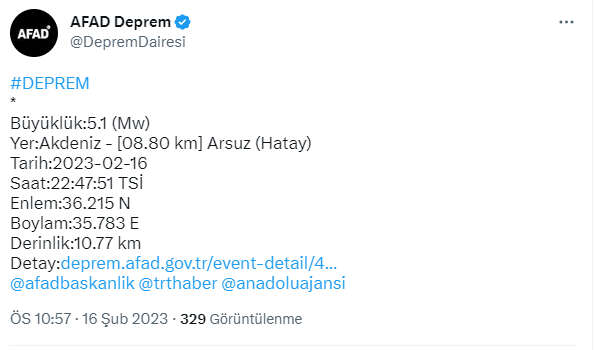 Afet ve Acil Durum Yönetimi Başkanlığı (AFAD), Hatay'ın Arsuz ilçesinde saat 22.47'de meydana gelen depremin yerin 10 kilometre derinliğinde olduğunu ifade etti.