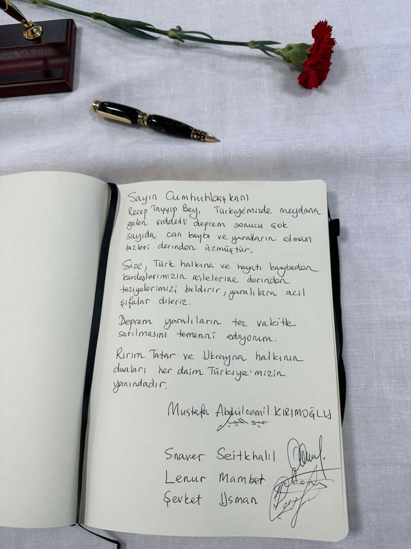 Kırım Tatar halkının milli lideri Mustafa Abdülcemil Kırımoğlu, Türkiye’nin Kıyiv Büyükelçiliğinde açılan taziye defterini imzalayarak hayatını kaybedenlerin yakınlarına başsağlığı, yaralılara acil şifa dileyerek şu ifadelere yer verdi: