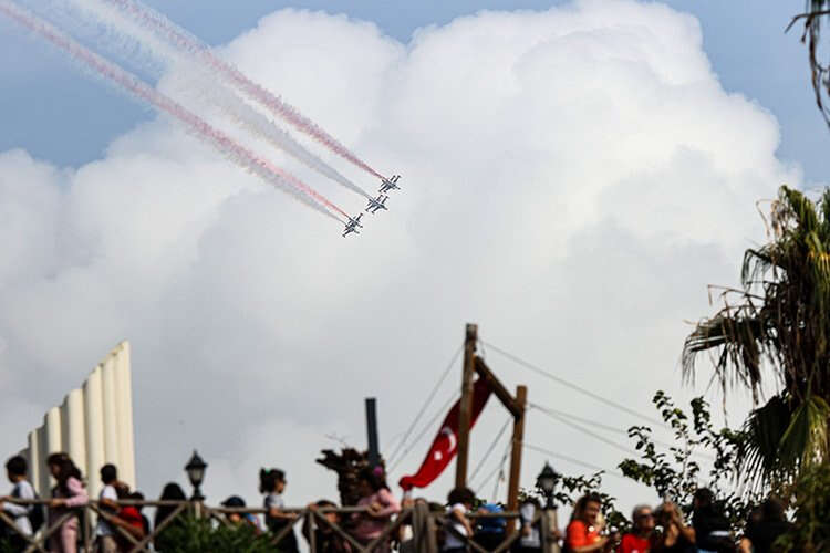Türk Yıldızları'nın, Konyaaltı Sahili'nde yaklaşık 30 dakika süren uçuşunu çok sayıda vatandaş izledi. Pilotların gösteri uçuşunda en çok alkışı, arkalarında bıraktıkları dumanla kalp çizdiği kısım aldı.