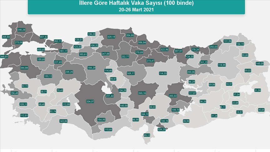 İllerin her 100 bin kişide haftalık (20-26 Mart) Kovid-19 vaka sayısı şöyle: