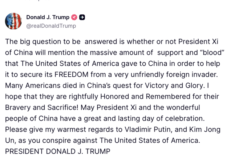Bununla birlikte İkinci Dünya Savaşı'nın bitişinin 80. yıl dönümü kutlaması kapsamında Çin’de bulunan Rusya Devlet Başkanı Vladimir Putin ve Kuzey Kore Lideri Kim Jong Un’s işaret eden Trump, “ABD’ye karşı komplo kurarken lütfen Vladimir Putin ve Kim Jong Un'a en içten selamlarımı iletin.” cümlelerini sarf etti.