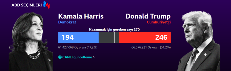 Trump’ın zaferi Arizona, Michigan, Nevada, Pennsylvania ve Wisconsin gibi kritik eyaletlerde de sürüyor. Bu eyaletlerdeki üstünlüğü, Trump’ın yeniden başkan seçilmesi için gerekli 24 delegeyi kazanmasına oldukça yakın olduğunu gösteriyor.