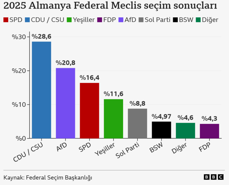 Almanya'da 23 Şubat 2025 tarihinde gerçekleşen erken genel seçimlerde Friedrich Merz'in liderliğindeki CDU, oyların yüzde 28'ini alarak sandıktan birinci çıktı.