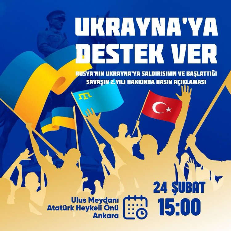 Ukrayna Derneği, düzenlenecek protesto ve basın açıklamasına ilişkin, "Ukrayna’ya destek vermek isteyen dostlarımızı, Rusya’nın Ukrayna’ya saldırısının ve başlattığı savaşın 2.yılı hakkında yapacağımız basın açıklaması için 24 Şubat 2024, Cumartesi günü saat 15:00’de Ulus Meydanı’nda Atatürk Heykeli önünde buluşmaya davet ediyoruz" açıklamasını yaptı.