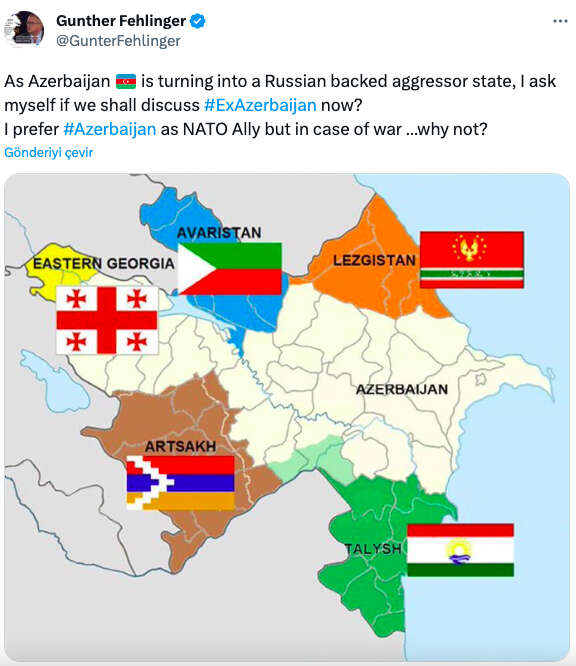 NATO Genişleme Avrupa Vakfının Kurucusu, Avusturyalı siyasetçi Gunther Fehlinger, sosyal medya hesabından yaptığı paylaşımda Azerbaycan'ın toprak bütünlüğünü hiçe saydı. Harita, Azerbaycan Türkü kullanıcılar tarafından tepki toplarken, Ermeniler tarafından desteklendi.