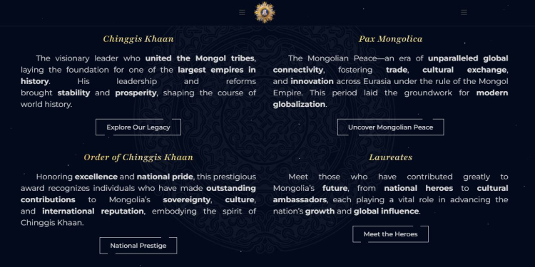 İnternet sayfasında; Moğolistan'ın tarihi, kültürel mirası ve Moğolistan Devlet Yüksek Nişanı olan Cengiz Han Nişanı'nın tanıtımı amaçlanıyor. İngilizce olarak servis edilen internet sayfası; "Cengiz Han'ın Hayatı ve Mirası", "Pax Mongolica (Moğol İmparatorluğu'nun reform politikaları)", "Kriterler ve Aday Gösterme Süreci (Cengiz Han Nişanı'na aday gösterme kriterleri ve süreçleri)", "Tasarım ve Sembolizm (Cengiz Han Nişanı'nın özellikleri)","Ödül Sahipleri", "Törenler ve Galeri" olmak üzere 6 bölümden oluşuyor.