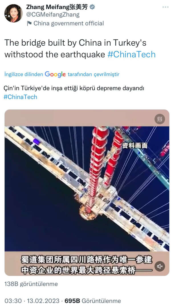 Çin'in Kuzey İrlanda Belfast Başkonsolosu Zhang Meifang, 1915 Çanakkale Köprüsü'nün Çin tarafından yapıldığını ileri sürdü. Türkiye'de yaşanan deprem felaketi nedeniyle açıklamalarda bulunan Çinli diplomat dikkat çeken mesajlarda bulundu. Başkonsolos Meifang, sosyal medya hesabından, "Çin'in Türkiye'de inşa ettiği köprü depreme dayandı" ifadelerini kullanarak; köprüyü Çin'in yaptığını iddia etti.