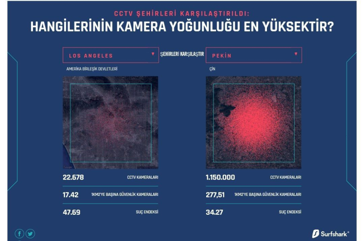 Daha çarpıcı olan bir diğer veri ise şehir başına düşen kilometrekaredeki güvenlik kamerası sayısı. Pekin’de her 1 kilometrekareye tam 277,51 kamera düşerken, Los Angeles’ta bu sayı yalnızca 17,42 olarak ölçüldü. Bu fark, Pekin’in neden dünyanın en çok gözetlenen şehirlerinden biri olarak kabul edildiğini açıklıyor. İlginç bir şekilde, suç oranları açısından bakıldığında Los Angeles’ın suç endeksi 47,69 iken, Pekin’de bu oran 34,27 olarak tespit edildi. Bu veri, yüksek sayıda kameranın suç oranlarını düşürmede ne kadar etkili olduğu konusunda tartışmalara kapı aralıyor.